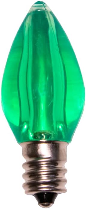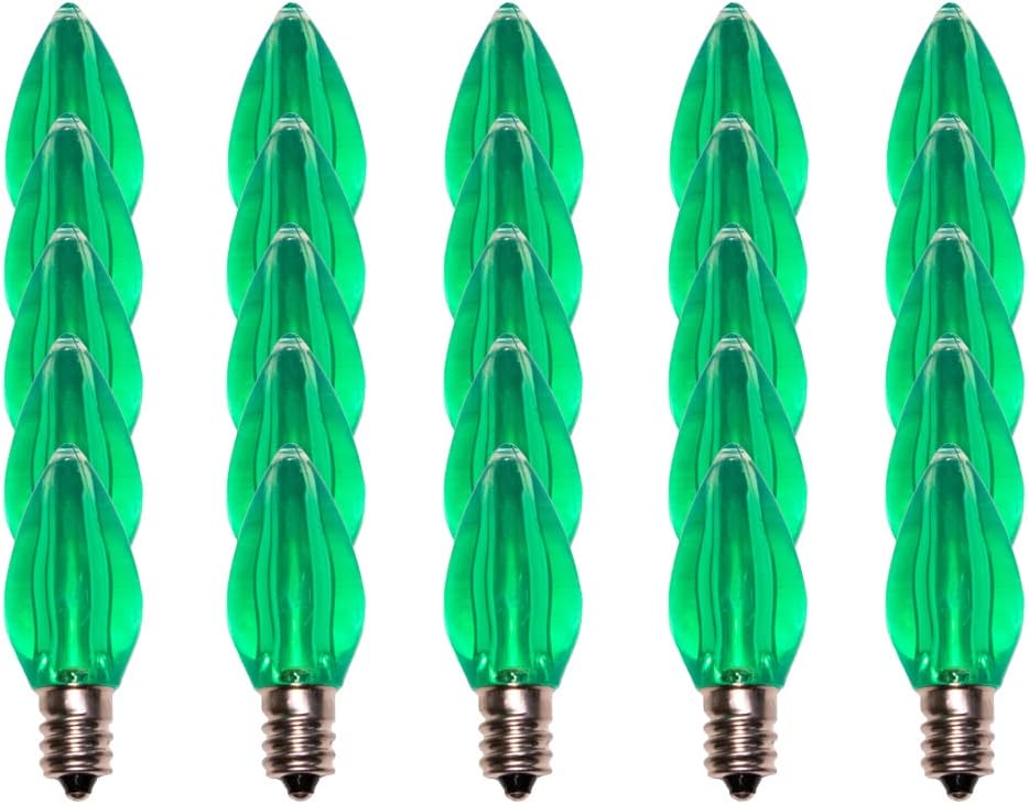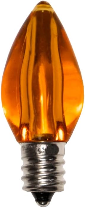 Box of 25 Warm white C7 Smooth Transparent LED replacement bulbs screw into C7 sockets with E12 base (candelabra). box of 25 These C7 bulbs have SMD LED's inside and are available in many colors and last for years. Led C7 bulbs are great year round decor. Specifications 2.14 tall (total height including base) 1.5 tall (just the bulb/lens) 120v, 0.8 watts per bulb, Dimmable, UL Listed
