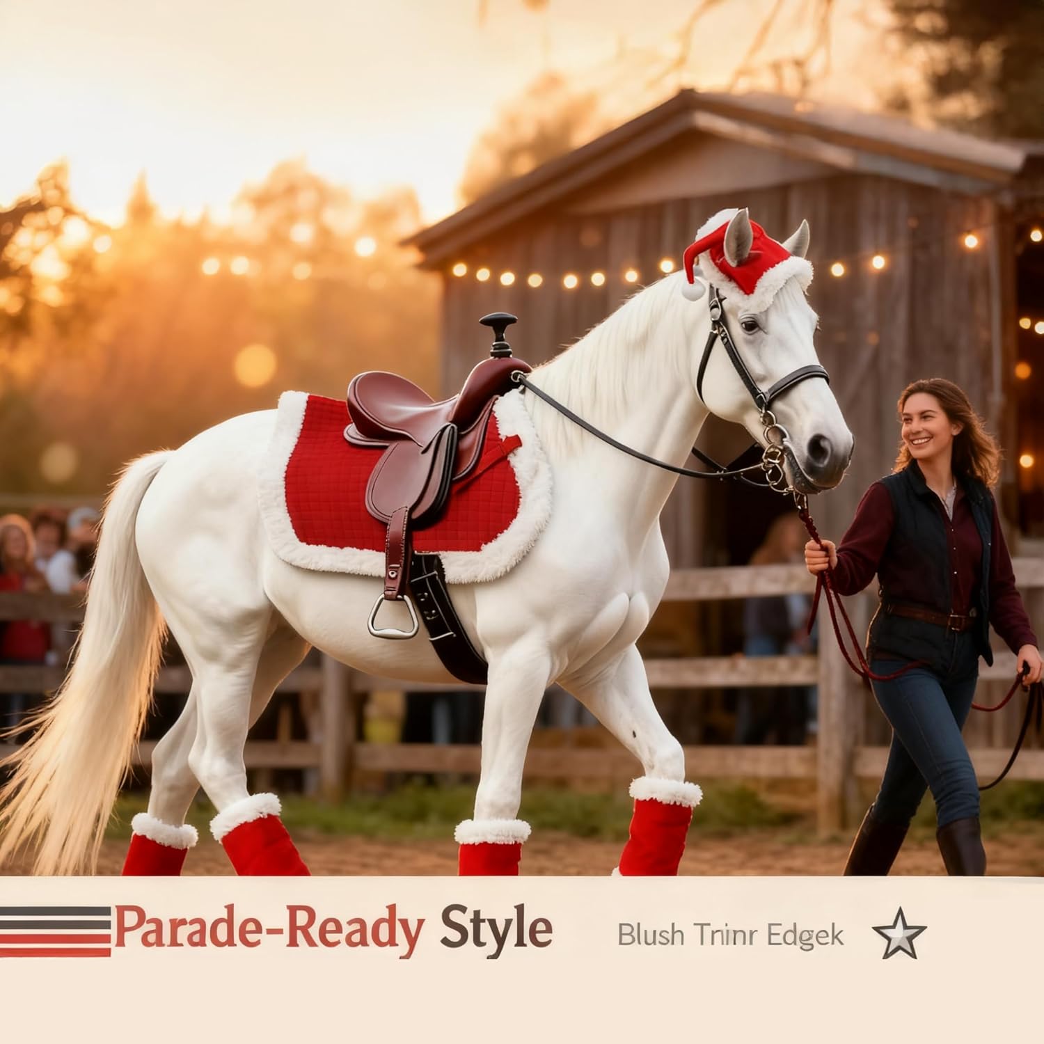 Give your barn a centerpiece moment. This coordinated 6-piece equestrian costume turns any horse into a holiday standout with classic Santa red and plush white trim. The matching set includes a smooth, photo-friendly saddle pad, four adjustable leg wraps, and a festive hat with pom-pom—built to create a clean silhouette that reads beautifully in winter light. Dress fast at the trailer or in the aisle; hook-and-loop style closures on the wraps (assumed) help you get camera-ready in minutes. Ideal for small-town parades, fun-show theme days, barn parties, and family photo cards, then store and bring it back next year. For best results, introduce gradually and use during supervised walking or light flat work only. Size by leg circumference and pad dimensions; wraps adjust for a tidy fit. Care is simple: spot clean the plush trim and air dry. When you want festive style without DIY guesswork, this head-to-hoof set delivers a bold look and easy convenience in one box.