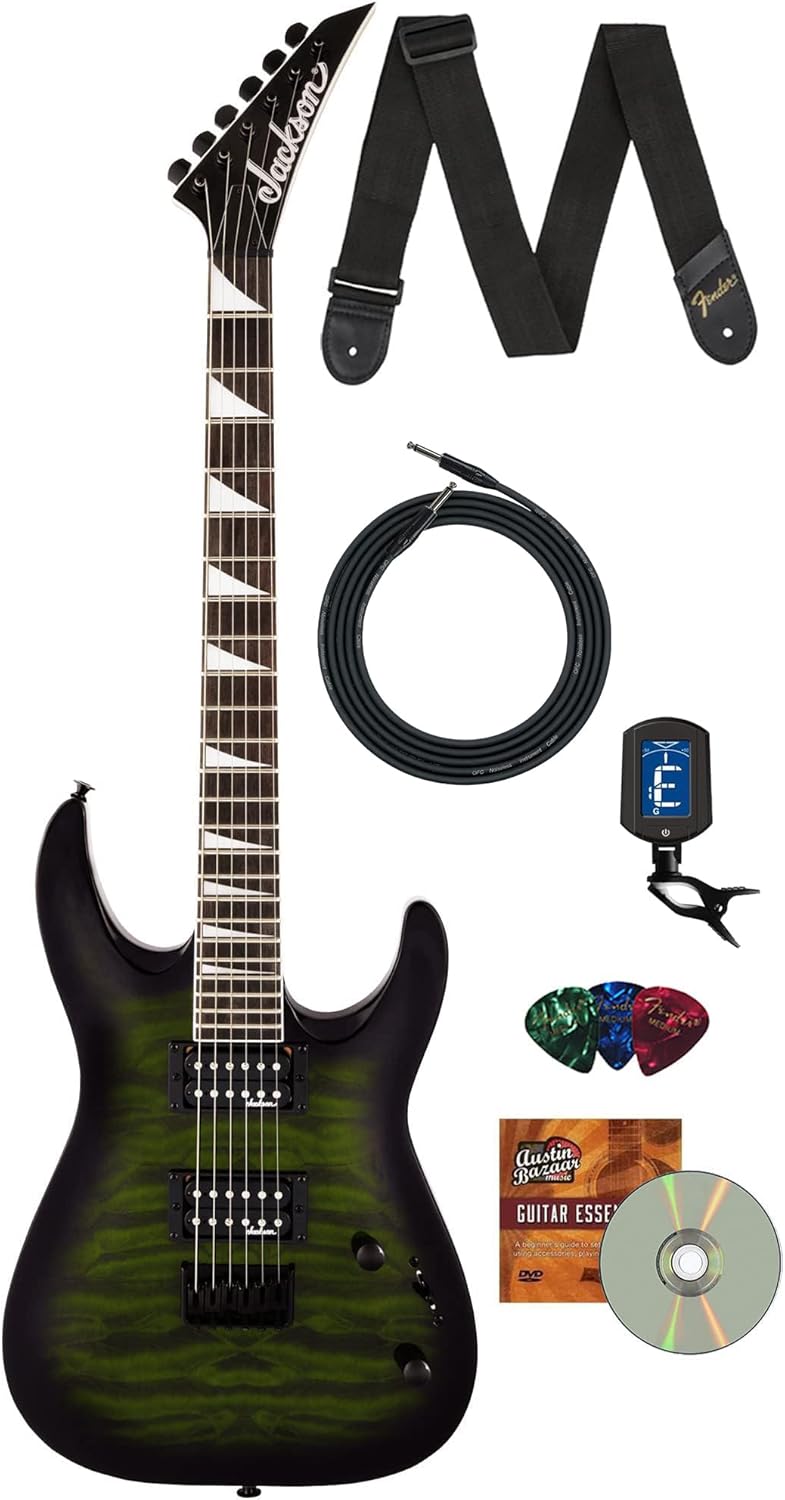 The JS Series Dinky Arch Top JS32 DKAP is a high-performance guitar designed for rock and metal enthusiasts. With a poplar body featuring a stunning art-grain poplar burl arched top and a bolt-on maple neck with scarf joint and graphite reinforcement, this guitar ensures rock-solid stability. Equipped with three-way blade switching and single volume and tone controls, along with a Jackson-branded Floyd Rose licensed double-locking bridge, this guitar provides dynamic trem action and tuning stability for expressive playing. SERIES: JS ORIENTATION: Right-Hand COLOR: Transparent Black COUNTRY OF ORIGIN: CN HEADSTOCK: Jackson Pointed 6-In-Line NECK MATERIAL: Maple NECK FINISH: Satin NECK CONSTRUCTION: Bolt-On with Graphite Reinforcement and Scarf Joint FINGERBOARD RADIUS: 12"-16" Compound Radius FINGERBOARD MATERIAL: Amaranth POSITION INLAYS: Pearloid Sharkfin NUMBER OF FRETS: 24 TRUSS ROD: Dual-Action TRUSS ROD NUT: Truss Rod Adjustment at Nut STRING NUT: Floyd Rose Licensed Jackson NUT WIDTH: 1.6875" NUT MATERIAL: Floyd Rose Licensed Jackson BODY: Poplar BODY FINISH: Gloss BODY SHAPE: Dinky BODY TOP: Poplar Burl Art Grain BODY MATERIAL: Poplar DIMENSIONS: 5.40x19.70x44.40 IN SHIPPING WEIGHT: 11.40 LB FRET SIZE: Jumbo SCALE LENGTH: 25.5" PICKUP CONFIGURATION: HH Adding value to your purchase, Austin Bazaar bundles your instrument with quality accessories, saving you time and money. This bundle includes a guitar cable for reliable connection, a tuner for precise tuning, a strap for ease of play, and picks so that you always have extra. It also has an Austin Bazaar instructional DVD for you to pick up some lessons as soon as you start. Everything you need to play right out of the box! CALIFORNIA PROPOSITION 65 WARNING WARNING: Cancer and Reproductive Harm - www.P65Warnings.ca.gov