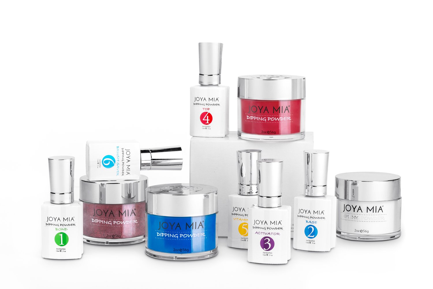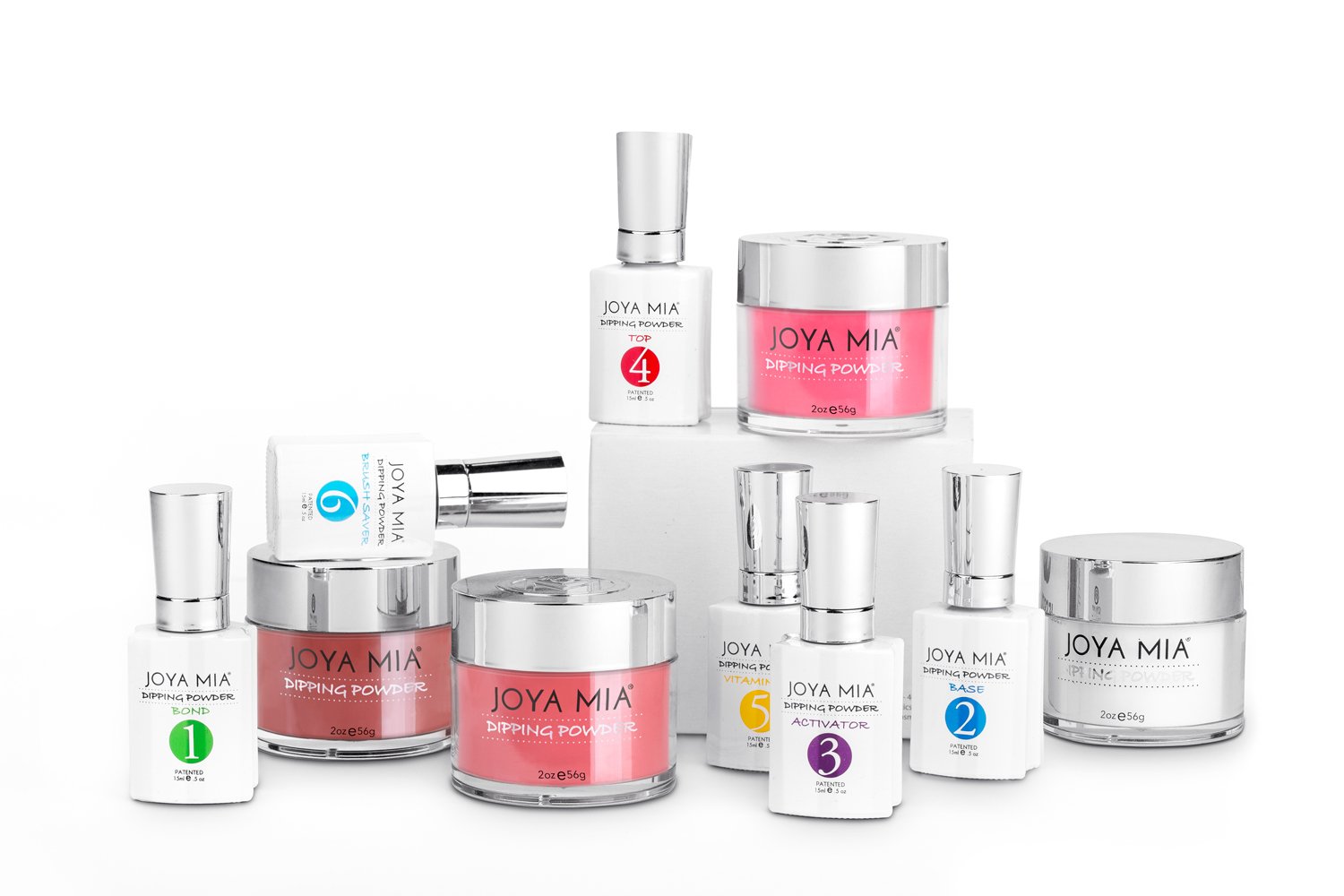 Say hello to our latest line! Joya Mia Dipping powder system is the new way to get salon quality manicure with the wearability of a gel and the durability of an acrylic. Joya Mia Dipping powder system will make your nails feel light, strong, shiny and naturally beautiful every time! Joya Mia Dipping Powder Starter Kit Includes: Bond , Base, Top, Activator, Top, cuticle oil, 3 powder colors and clear powder Instruction for JOYA MIA Dipping Powder System: 1) Push the cuticles back and buff your nails to remove shine, dirt or oil. 2) Cover the prepped natural nail plate with Joya Mia Bond and let it air dry before applying the Base Coat. 3) Apply Joya Mia Base Coat and dip your nails in the Joya Mia Clear Powder. Then, tap the powder excess from your nails. 4) Apply Joya Mia Base Coat and dip in the Joya Mia Color Powder. 5) Repeat step #4. 6) Apply Joya Mia Base Coat and dip in the Joya Mia Clear Powder. (Optional with regular color, must with glitter) 7) Apply a generous amount of Activator on each nail. Allow it to dry and make sure to cover the edges and cap the free edge. Once dry, shape the nails with a file or Joya Mia E-File. (You may use a buffer to smooth the nail area.) 8) Optional step: Rinse hands with water, no soap and let them dry. If you don't want to use water, use a brush to remove the dust excess. 9) Apply another generous amount of Activator and right away apply Joya Mia top coat (#4) Please note: You must apply quickly For perfect shine. Apply top coat in 2-3 very quick strokes.Then let it air dry for 1 min. 10) Apply second layer of the Joya Mia Top Coat. This time apply a slower, more detailed, then wait 1-2 minutes to dry. *To remove the dipping powder, slightly file off the top coat and then soak off for 10-15 min and you are done! You can clean your brush with brush saver, alcohol, acetone or soap and warm water!