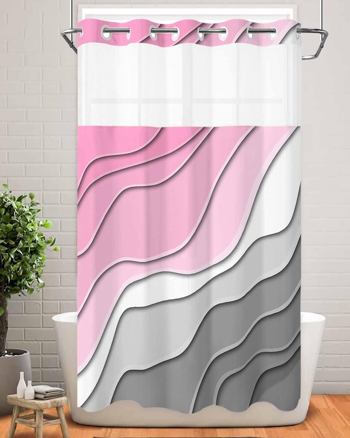 SIZE We offer a variety of sizes to choose from. Fit most standard-sized showers or tubs. 36" x 72" 36" x 78" 48" x 72" 54" x 78" 60" x 72" 66" x 72" 72" x 72" 72" x 78" 72" x 84" 72" x 96" Sheer Window The top of the curtain has a mesh fabric panel that lets light into the tub while maintaining privacy. Soft and smooth texture, waterproof. Magnets are installed in the bottom corner to increase stability and prevent splashing. Easy to Install With a removable waterproof snap on/off fabric liner. The snap on/off fabric liner is easy for removal, easy hanging and hassle-free installation. This shower curtain designed with "Split Rings" that let you hang them easily. Modern Style A variety of patterns, classic fashion elements, suitable for hotel and home bathroom decoration. Upgrade the bathroom decoration to make you feel relaxed and comfortable. Easy to CleanMachine washable in gentle mode. Do not use bleach. If you are interested in this shower curtain or have other questions, please feel free to contact us.
