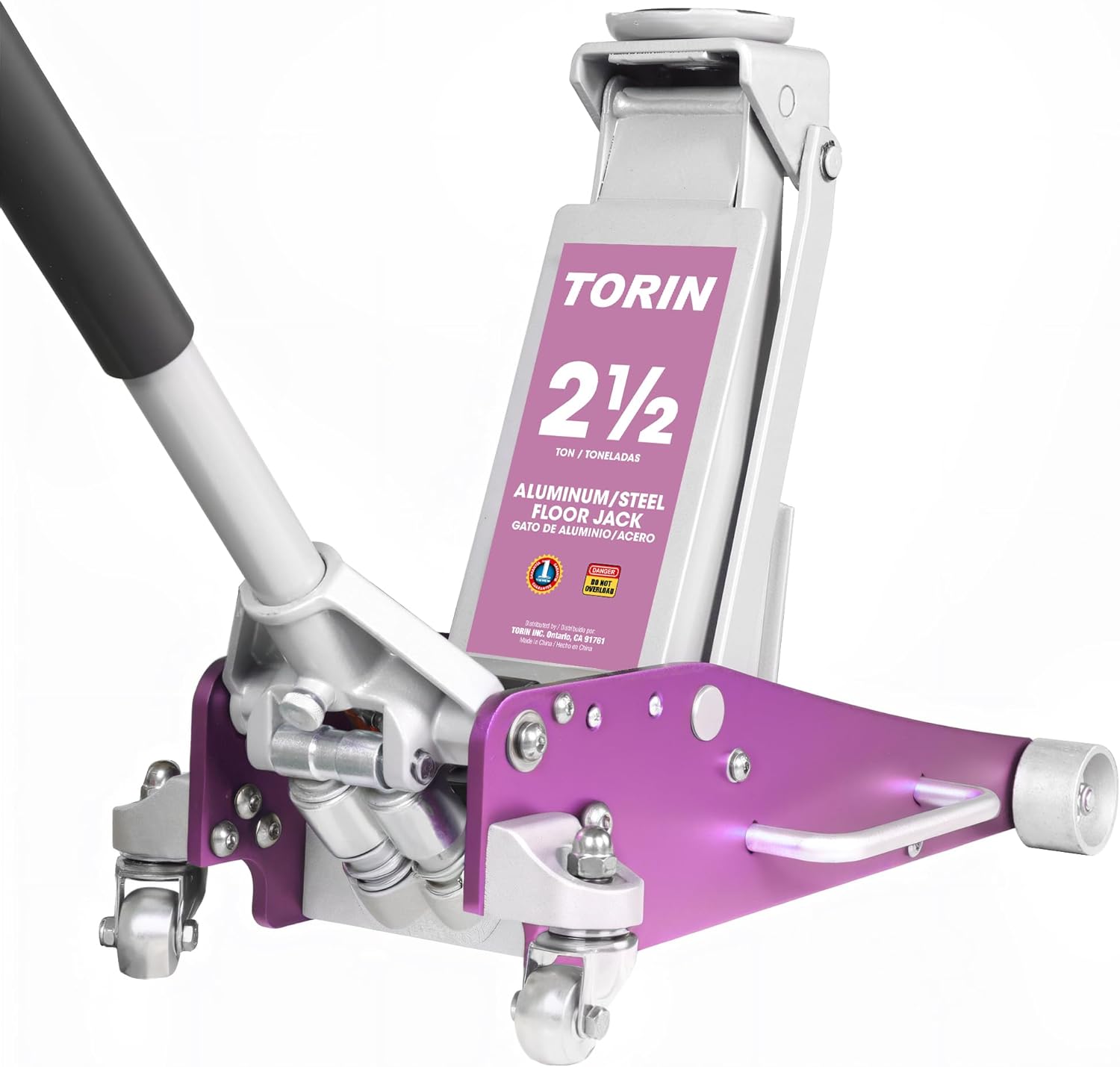 Torin Jack Aluminum and Steel Racing Jack - 2.5 Ton Quick-lift design to reach a maximum height. Saddle can be removed. 2-1/2 ton Lift Capacity. Minimum Lift Height: 4-1/8inch, Maximum Lift Height: 18-1/4inch. Aluminum and Steel metal frame. It only takes 6 strokes to reach the maximum lift. Base: 26-3/8inch x 12-1/2inch.