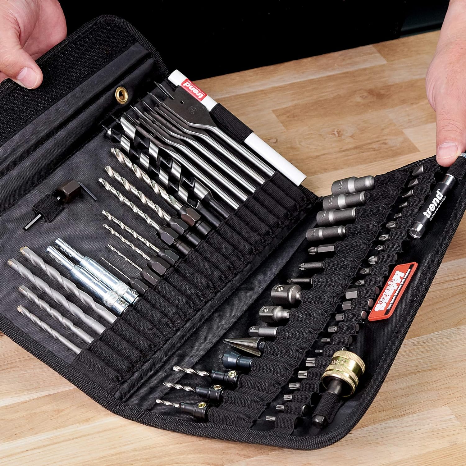 This heavy-duty fabric tool holder come with an assortment of useful, Snappy tools. Included in the set: Standard Quick Chuck; Masonry bits 5-8mm; Drill bit guide 6 and 8; Drills 1-7mm; Auger bits 10 and 13mm; Flat bits 16, 19, 22, 25 and 30 mm; Drill countersinks 2.5, 3.25 and 3.5mm; Deburrer/countersink; Hole enlarger; Square drive adapter 1/4,3/8 and 1/2in; Screwdriver bit Pozi 1-3; Magnetic drivers 6, 8, 10 and 12 mm; A/F; Snappy Pencil; Insert bits; Magnetic bit holder (including 5 slotted 3 Pozi, 3 Phillips, 6 hex and 6 Torx).