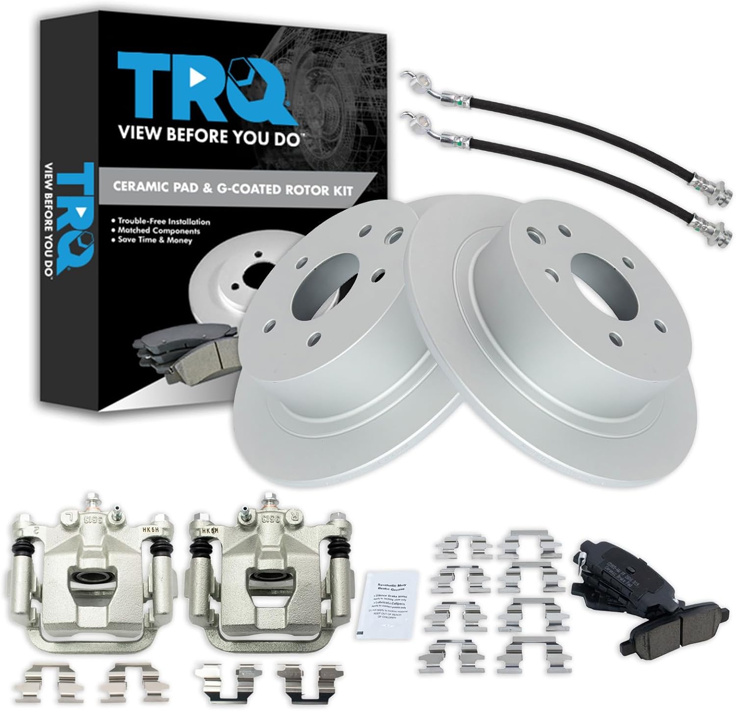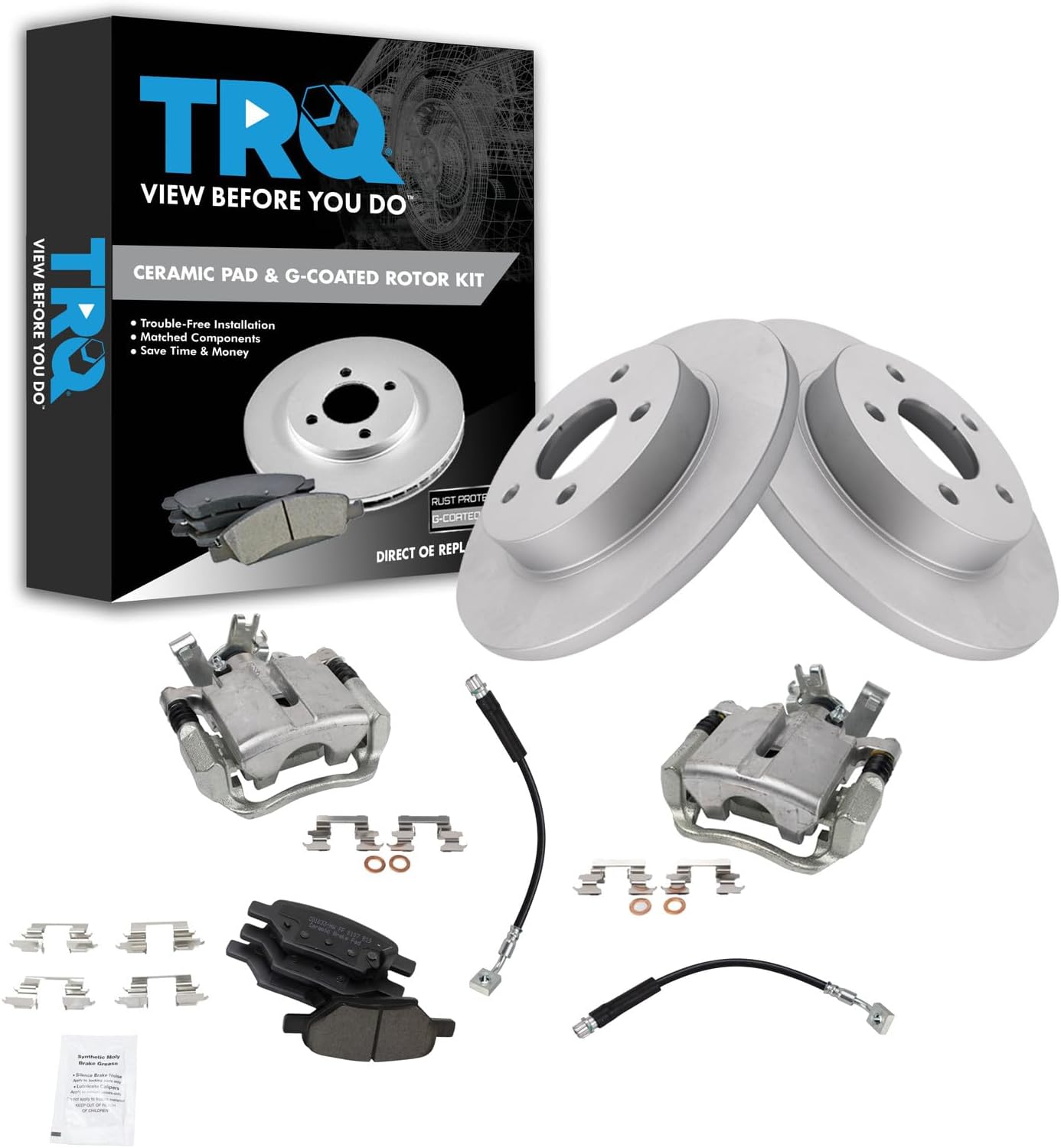Ceramic Brake Pad & Rotor KitKit Includes(1) Rear Ceramic Brake Pad Set(2) Rear Brake Calipers(2) Rear Premium G-Coated Brake Rotors(2) Rear Replacement Brake HosesFitmentFord Five Hundred 2005-07 - RearFord Freestyle 2005-07 - RearMercury Montego 2005-07 - RearProduct AttributesFriction Material Composition: CeramicBrake Pad Friction Material: CeramicBrake Rotor Coating: Premium G-CoatedBrake Pad Bonding Type: Premium PosiProduct Features Positive Molded: Less dust resulting in clean wheels Electrostatic Coated: Long-lasting rust protection G3000 Casting Alloy: Reduced noise and improved wear resistance Application Specific Design: Extended service life, no modificationsItem DetailsTRQ brake kits are designed to restore your brake system to like-new performance. TRQ brake pads are positive molded, thermal scorched, chamfered, and utilize a multi-layer shim for enhanced performance and service life. TRQ G-coated rotors have long-lasting rust prevention, perfect for wheels with large openings that expose the rotor and rotor hat during daily drives. All products are fit and road-tested in our Massachusetts R&D facility to ensure we deliver on our promise of Trusted Reliable Quality.Reference Numbers14-329814-3299150.6142018-B494618-B494718FR246418FR246518J402322-17926L22-17926R331-54638331-54639350-541885F9Z2200AA5F9Z2200B5F9Z2A442AA7F9Z2200A99-17918L-C99-17918R-CBH143007BH382385C2S38068C2S48024C61549C61550EHT1071HFRC11815FRC11816H620620MGD1071CHSGD1071C