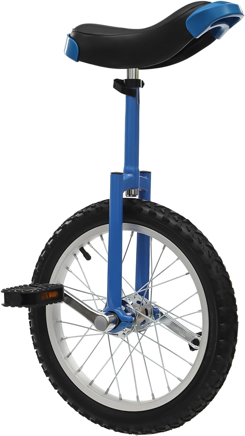 Discover a unique way to stay active with our versatile unicycle!Designed for riders of various ages and skill levels, it combines a sturdy manganese steel frame with an adjustable seat (28"-35.4" height range) to fit everyone from teens to adults. The 16"|18"|20"|24" treaded tire (varies by model) offers excellent traction on pavement, park trails, or smooth dirt, while the anti-skid pedals and ergonomic seat ensure a secure, comfortable ride.Beyond transportation, this unicycle is a fun tool for building balance, coordination, and lower-body strength. Its lightweight build and convenient handles make it easy to carry and store. Whether you're practicing in a driveway, commuting on campus, or looking for a stimulating workout, it’s a delightful challenge that promotes both physical and mental agility.NoteAssembly Required: Please follow the included manual. Tighten all parts, especially pedals, before riding.Safety First: Always wear a helmet, knee/elbow pads, and wrist guards (not included). Beginners should practice in a soft, open area (e.g., grassy field) with a fence or guide for support.Fit Check: Adjust seat height so your leg is nearly straight when the pedal is at its lowest. Ensure the seatpost is securely clamped.Weight & Height Limits: Refer to your model’s specifications. Do not exceed the maximum load capacity (110-165 lbs, depending on model).16" - Suitable Height 3.75' – 5.09' (Maximum Load Bearing Capacity: 110lbs)18" - Suitable Height 4.59' – 5.41' (Maximum Load Bearing Capacity: 165 lbs)20" - Suitable Height 5.09' - 5.74' (Maximum Load Bearing Capacity: 165lbs)24" - Suitable Height >1.75m/5.74' (Maximum Load Bearing Capacity: 154 lbs)Color/Size Variance: Slight color differences may occur due to lighting, and sizes may vary within 1-3 cm due to manual measurement.