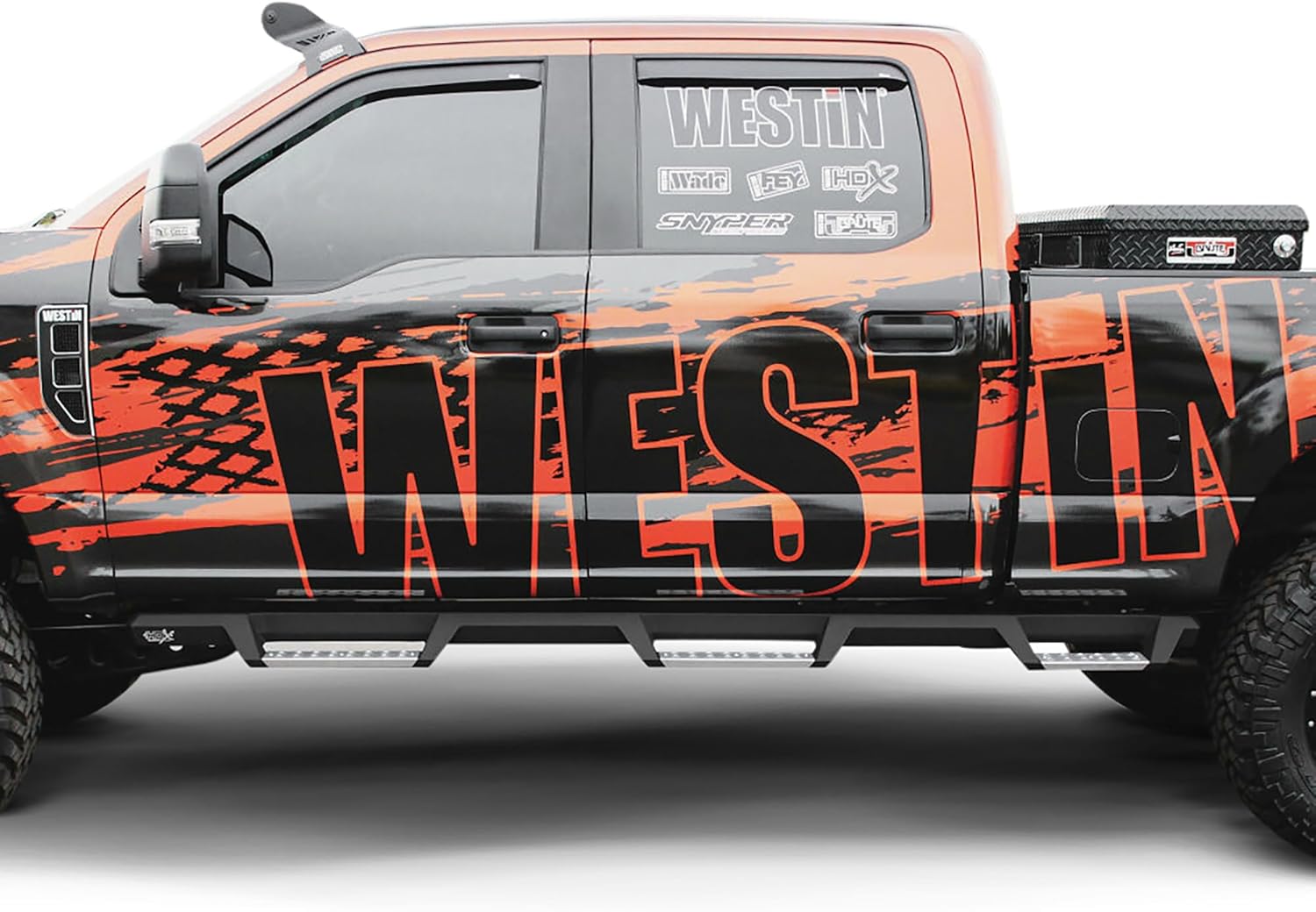 Westin's HDX Stainless Drop W2W Nerf Step Bars are built with corrosion-resistant, textured black painted stainless steel designed to last under the toughest of conditions. Built with 1-piece construction, these Nerf Step Bars feature a notched bar design with a 3rd step location for easy bed access and provide over 2 more inches of toe/heel step area than our competitors. The longer length of our HDX Stainless Drop WTW Nerf Step Bars provides added vehicle accessability, with the bar still fitting tight to your vehicle's rocker panel for a solid fit and rugged look. Product includes a set of installed stainless steel step pads as well as a set of black mild steel step pads so you can switch plates out based on preference. Step plates are rust resistant and provide maximum traction. Bolt-on installation so no drilling is required. Includes Mount Kit. Westin's exclusive Isolator Bracket supports the step bar past the truck cab, a feature that competitors do not offer. Without an Isolator Bracket, the step area that extends past the vehicle is left unsupported. Our unique design provides extra bed support without resulting in annoying creaking sounds.